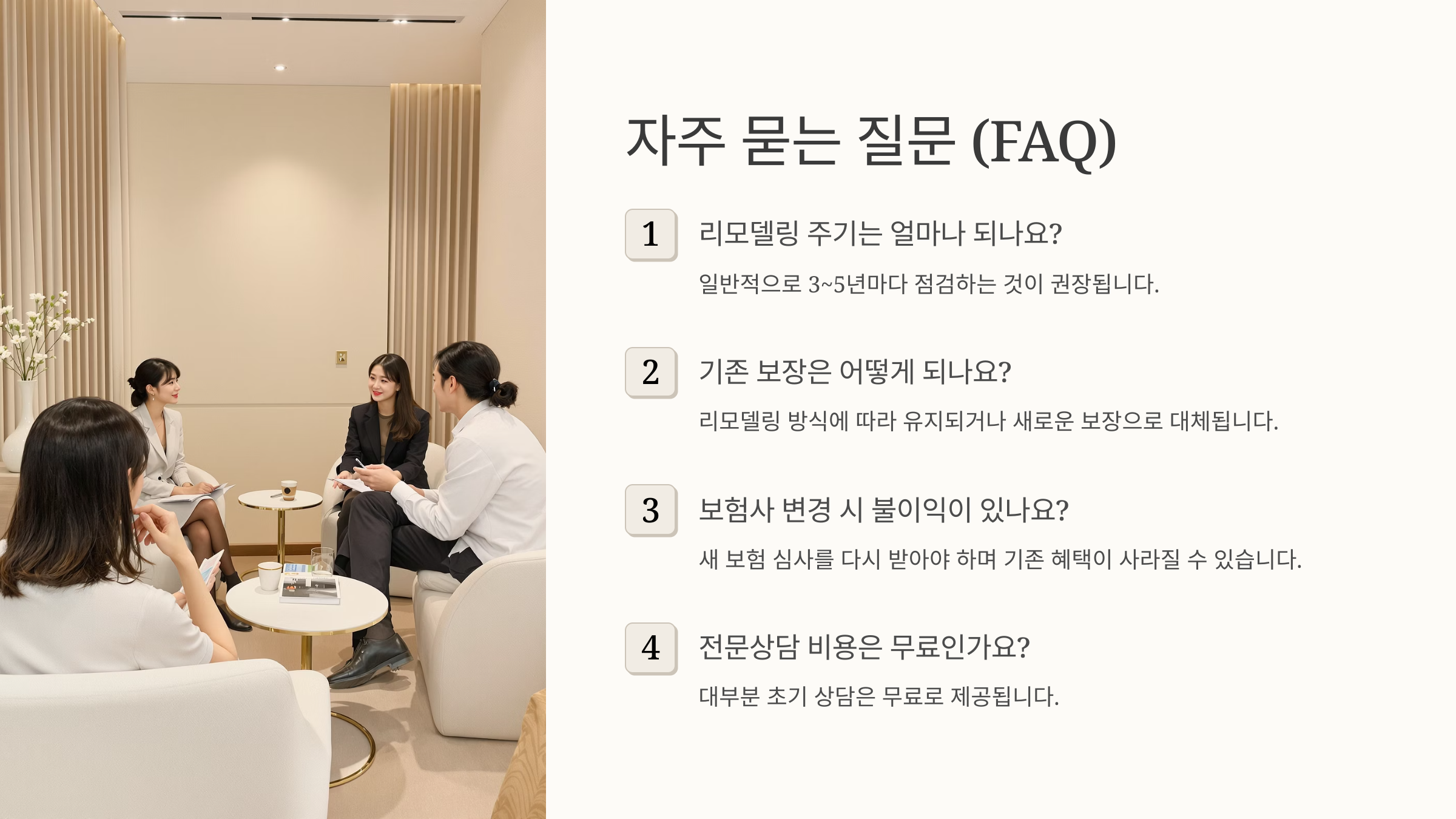 이처럼 리모델링은 단순히 ‘새 상품으로 바꾸는 것’이 아니라, ‘불필요한 지출을 정리하고 꼭 필요한 보장을 강화하는 전략적인 선택’이에요. 실제 상담 현장에서는 이런 사례들이 매일 쏟아지고 있어요. 보험료는 줄고, 보장은 오히려 풍성해지는 구조를 만드는 게 바로 리모델링의 묘미예요.