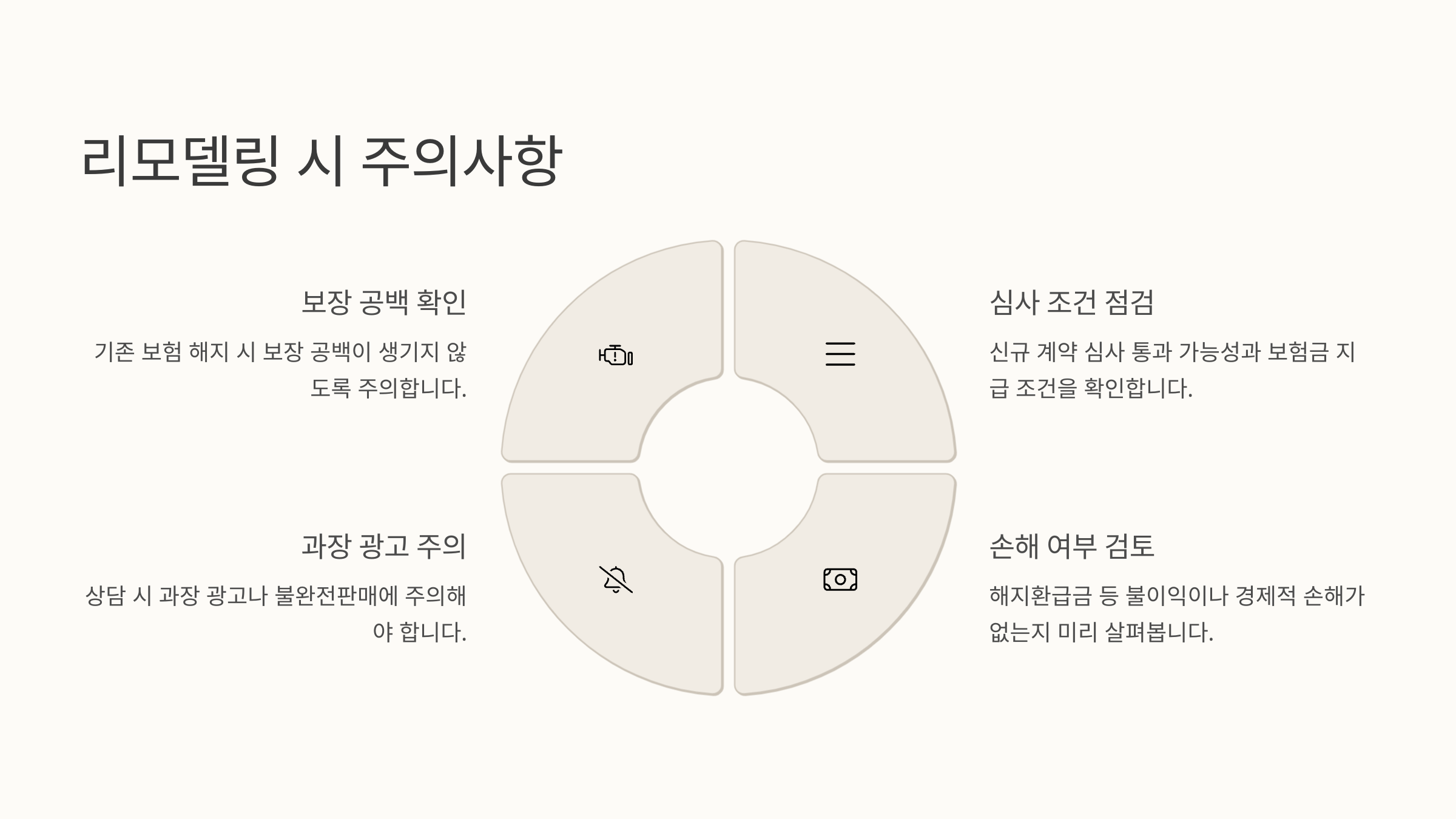 보험 리모델링이 분명 유리한 점이 많지만, 무작정 갈아타기만 한다고 다 좋은 건 아니에요. 오히려 잘못된 리모델링은 기존보다 보장이 축소되거나, 해지환급금 손실로 인해 손해를 볼 수도 있어요. 그래서 반드시 '주의사항'을 알고 접근해야 해요. 이게 바로 현명한 리모델링의 시작이에요. 🧐