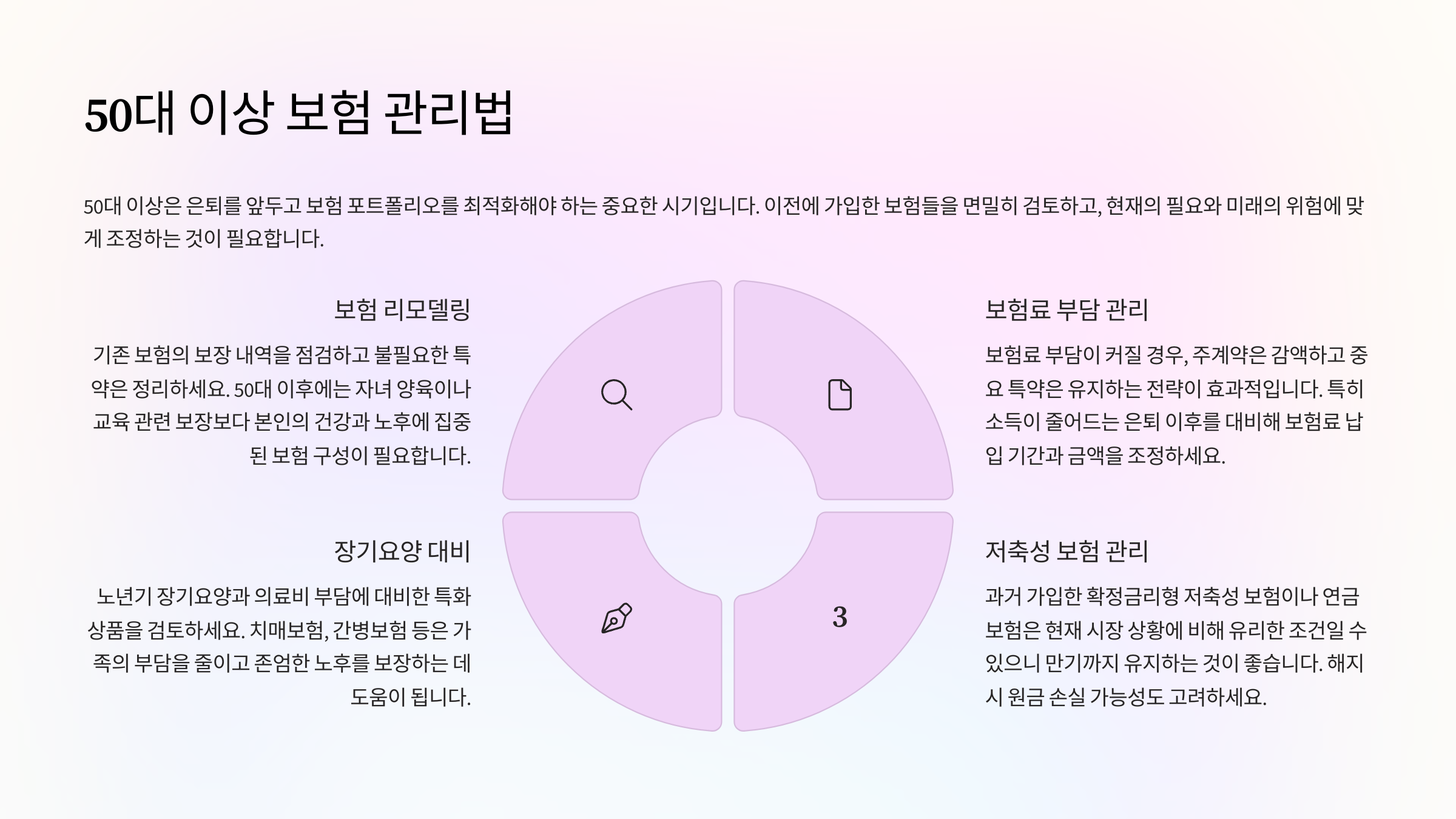 자산관리 측면에서도, 보험은 하나의 포트폴리오로 봐야 해요. 무조건 저축보다, 리스크를 줄이고 지출을 통제하는 방향으로 구성해야 50대 이후의 안정적인 삶이 가능하답니다.