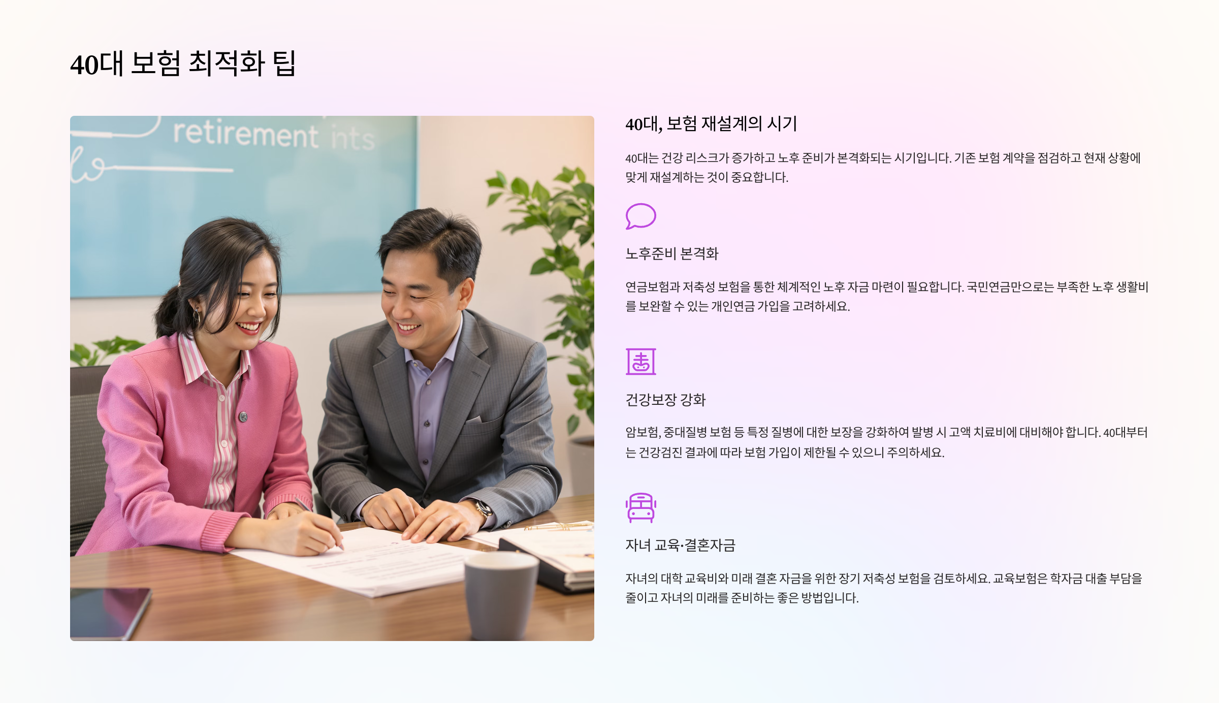 40대는 인생에서 가장 바쁜 시기이자, 가장 많은 책임을 지는 시기예요. 자녀 교육비, 주택 대출, 부모님 부양 등 경제적인 부담이 늘어나기 때문에 보험을 통해 리스크를 줄이는 것이 그 어느 때보다 중요해요.