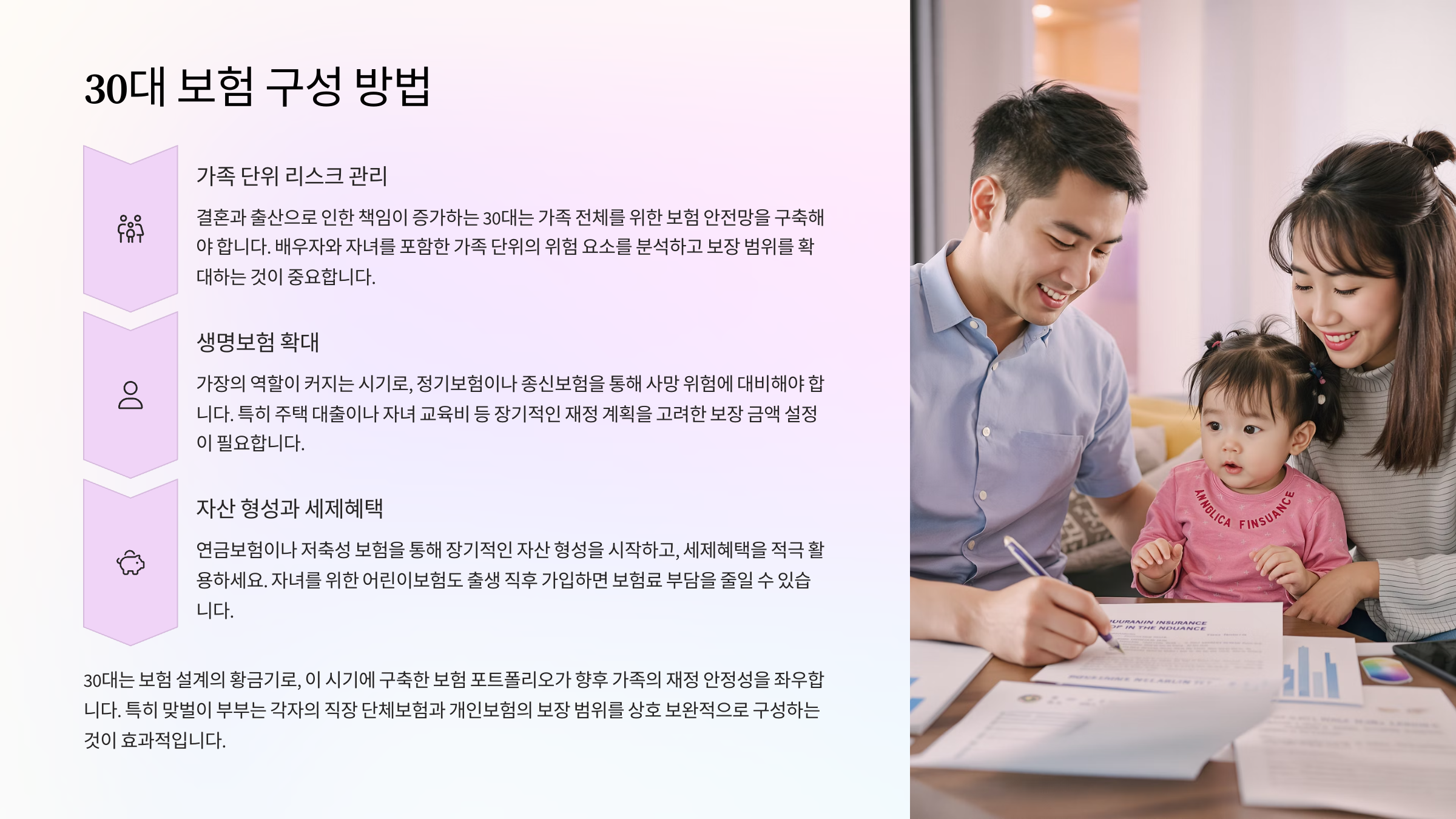 30대는 인생의 중요한 전환점이 많은 시기예요. 결혼, 출산, 주택 구입, 자녀 교육 등 삶의 기반을 다지는 일이 많아지면서 재정적으로도 큰 책임을 지게 돼요. 그래서 20대보다 더 체계적이고 꼼꼼한 보험 설계가 꼭 필요해요.