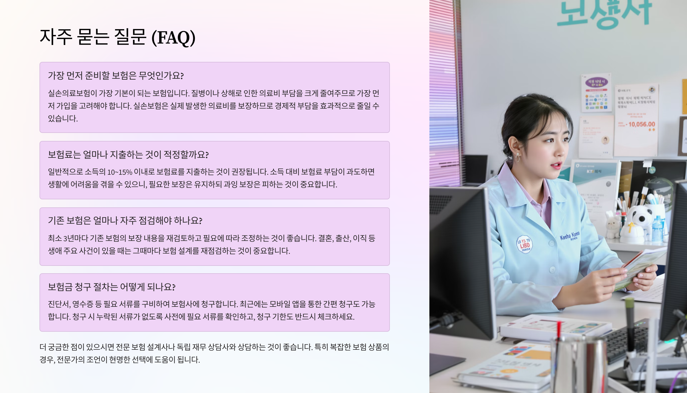 가장 중요한 건, ‘지금의 선택’이 10년, 20년 후 나의 삶의 질을 바꾼다는 점이에요. 무조건 비싼 보험보다는, 필요한 보장을 합리적으로 구성하는 것이 가장 스마트한 전략이에요.