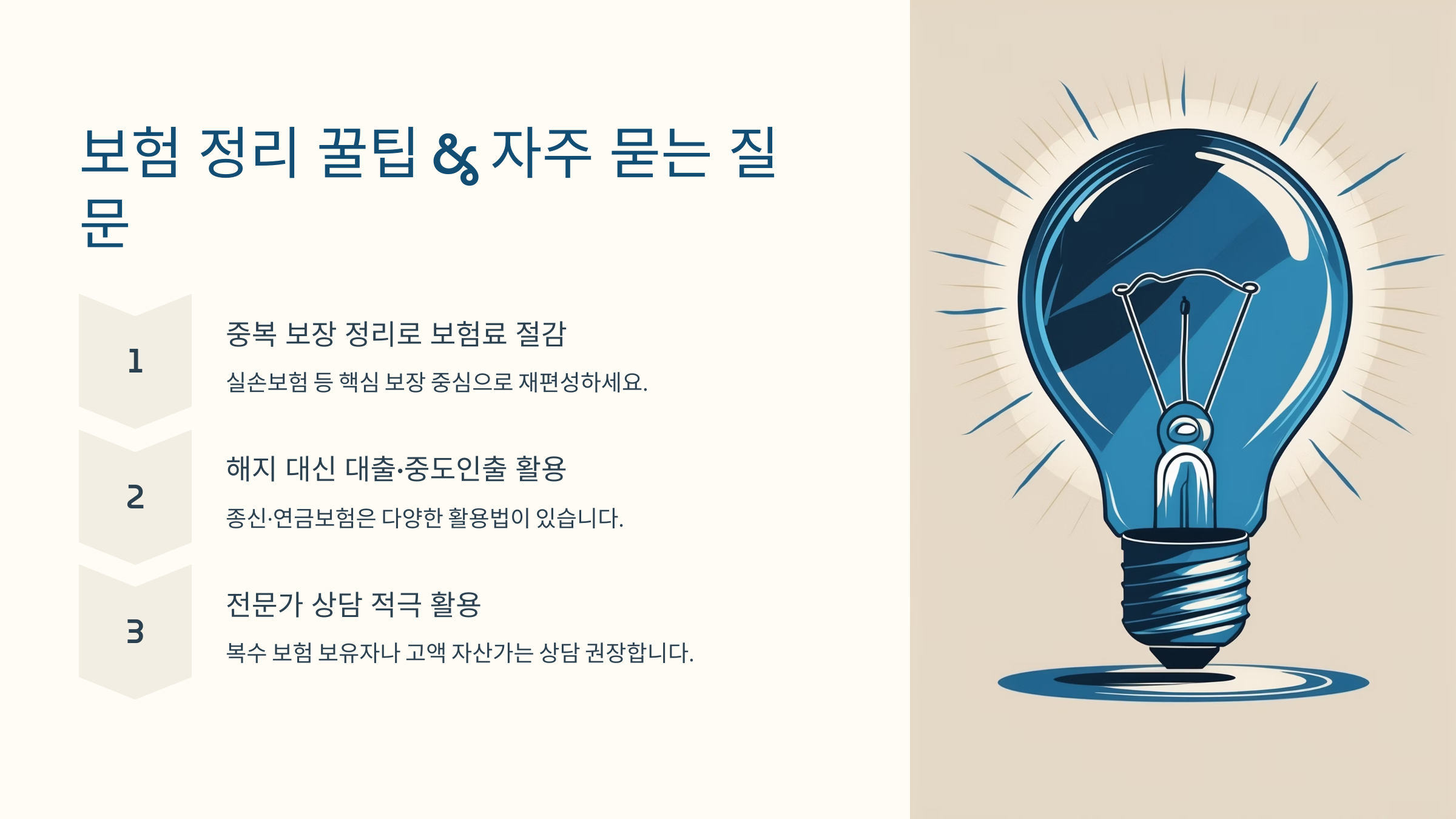 그렇다고 무작정 해지하는 건 위험해요. 보장이 필요한 보험은 유지하고, 중복되거나 목적이 불분명한 보험부터 정리하는 게 좋아요. 내가 생각했을 때, 이 판단 기준을 먼저 세우는 게 핵심이에요. 🧠