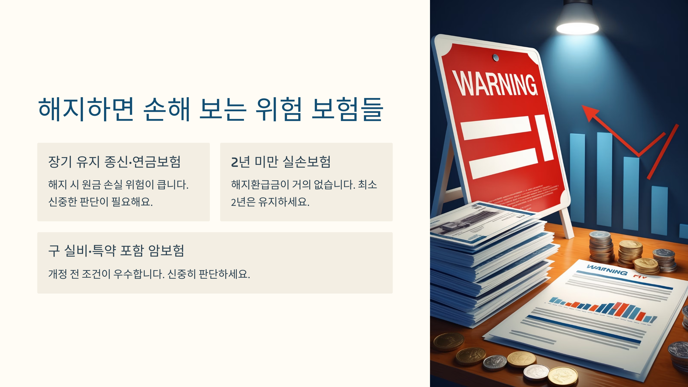 해지한다고 무조건 유리한 건 아니에요. 특히 납입기간이 짧거나, 유지기간이 오래된 보험은 ‘해지 시 손해’가 클 수 있어요. 이럴 땐 중도 해지보다 다른 방법이 더 나을 수 있어요.