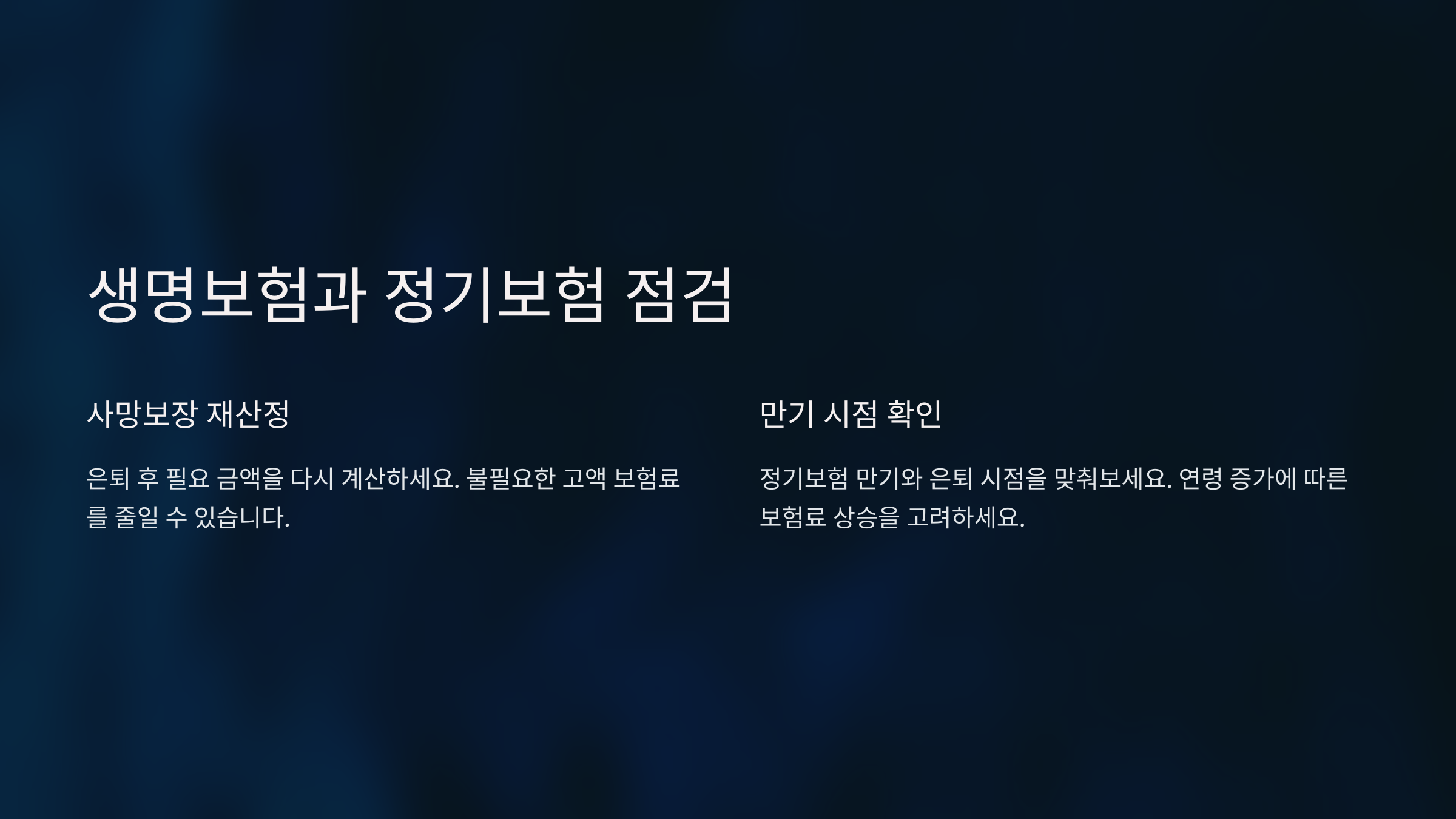 특히 정년을 앞두고 있거나, 자녀 교육비 지출이 끝나는 시점에는 보험료 부담을 줄이면서도 보장을 강화할 수 있는 최적의 타이밍이에요. 불필요한 특약은 정리하고, 꼭 필요한 보장만 남기는 ‘보험 다이어트’가 필요하죠.