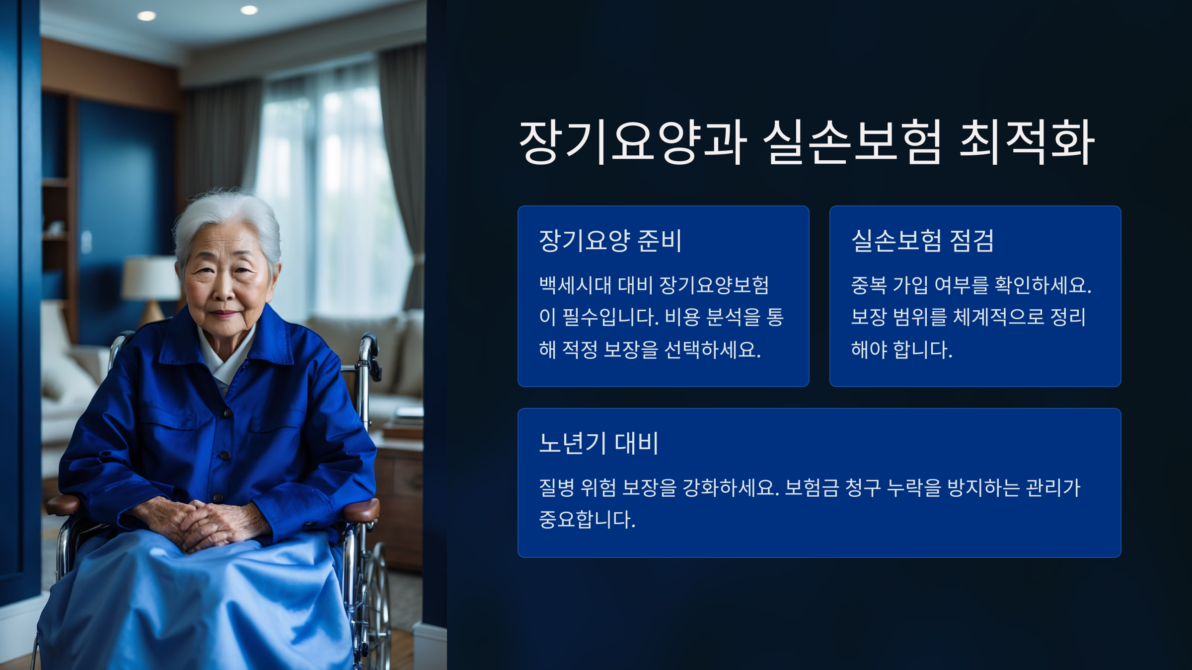특히 노후 실손보험은 자기부담금이 크기 때문에 보완책으로 장기요양 보장을 준비하는 게 좋아요. 지급 기준도 엄격해지고 있는 추세이니 미리 준비해두는 게 유리해요.