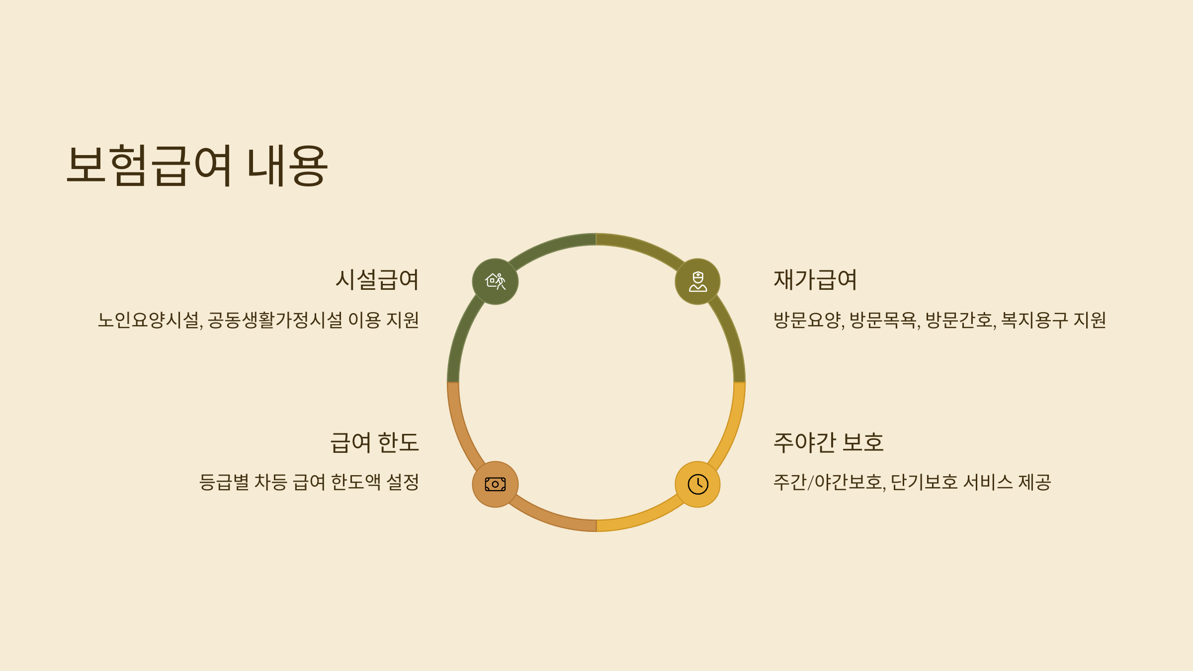 | 재가급여 | 집에서 돌봄: 방문요양, 주·야간보호, 단기보호, 방문목욕 |
