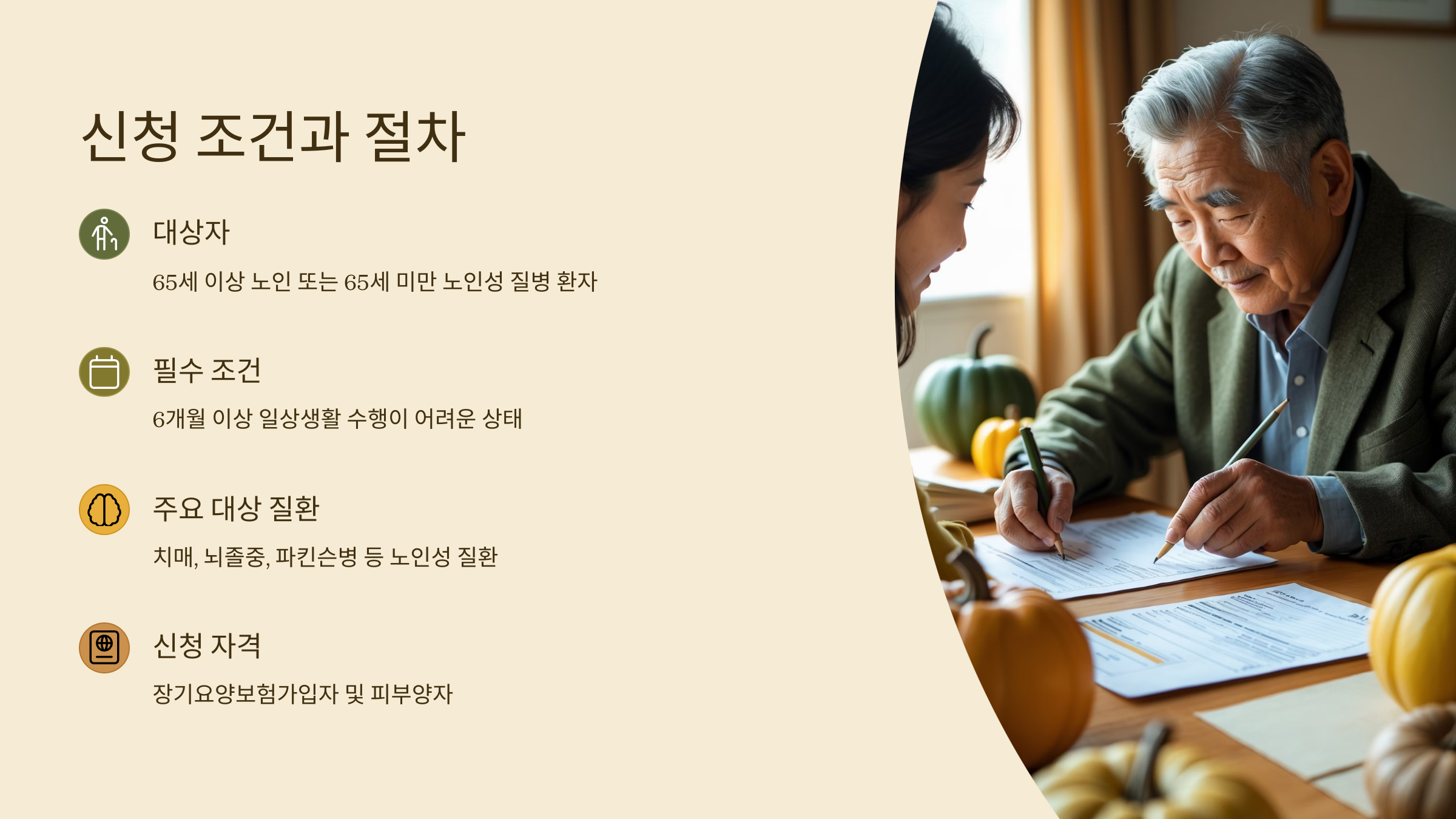 65세 이상이거나 노인성 질환(치매, 파킨슨병 등)이 있으면 바로 신청 가능하니, 서둘러 준비하면 혜택을 더 빨리 받을 수 있어요. 특히, 병원 진료 중에 의사소견서를 미리 받아두면 신청이 훨씬 수월해진답니다.