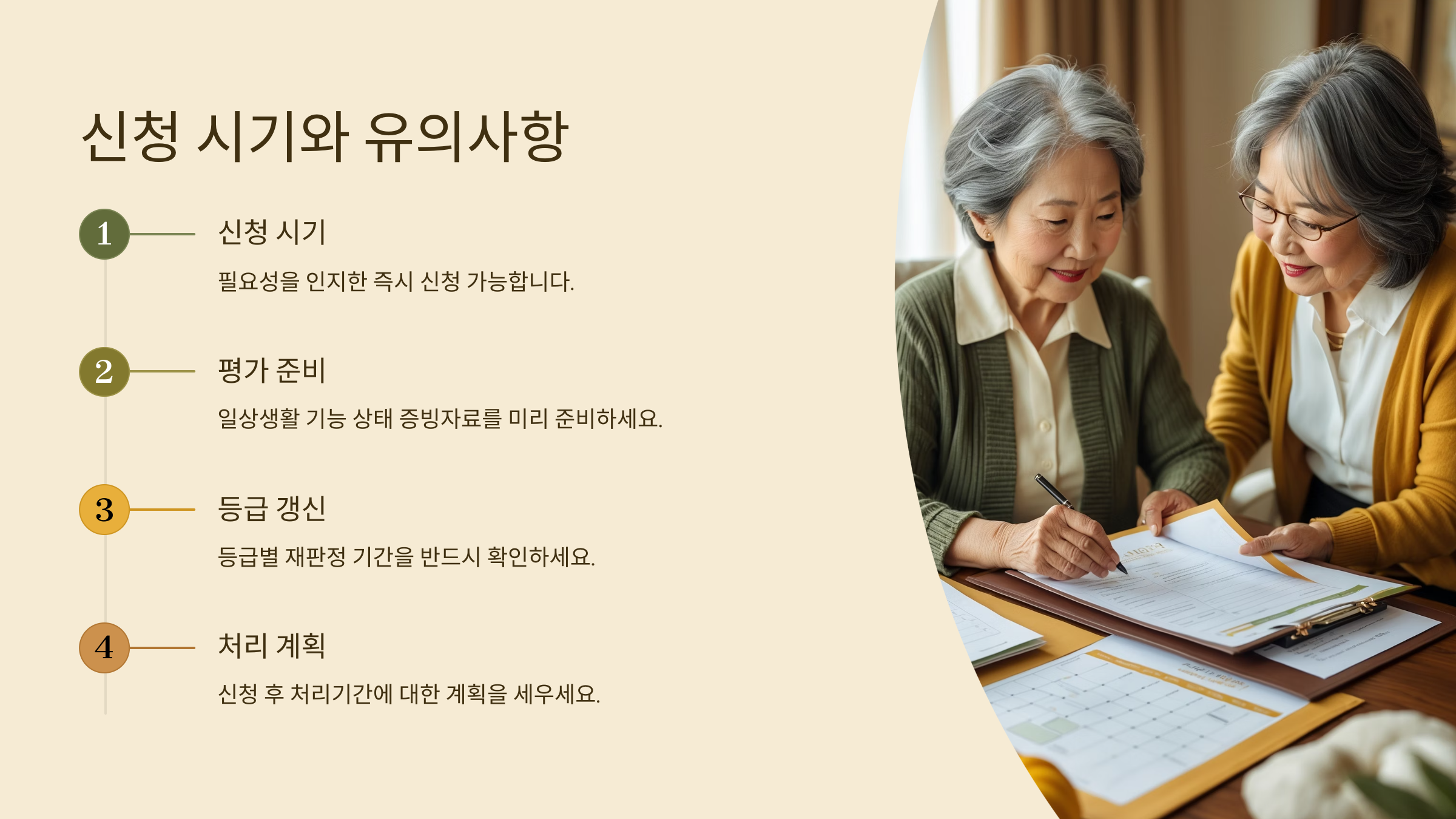 | 부모님이 불편함을 느끼기 시작할 때 | 서둘러 신청해서 조사받기, 늦으면 돌봄 공백 발생 |