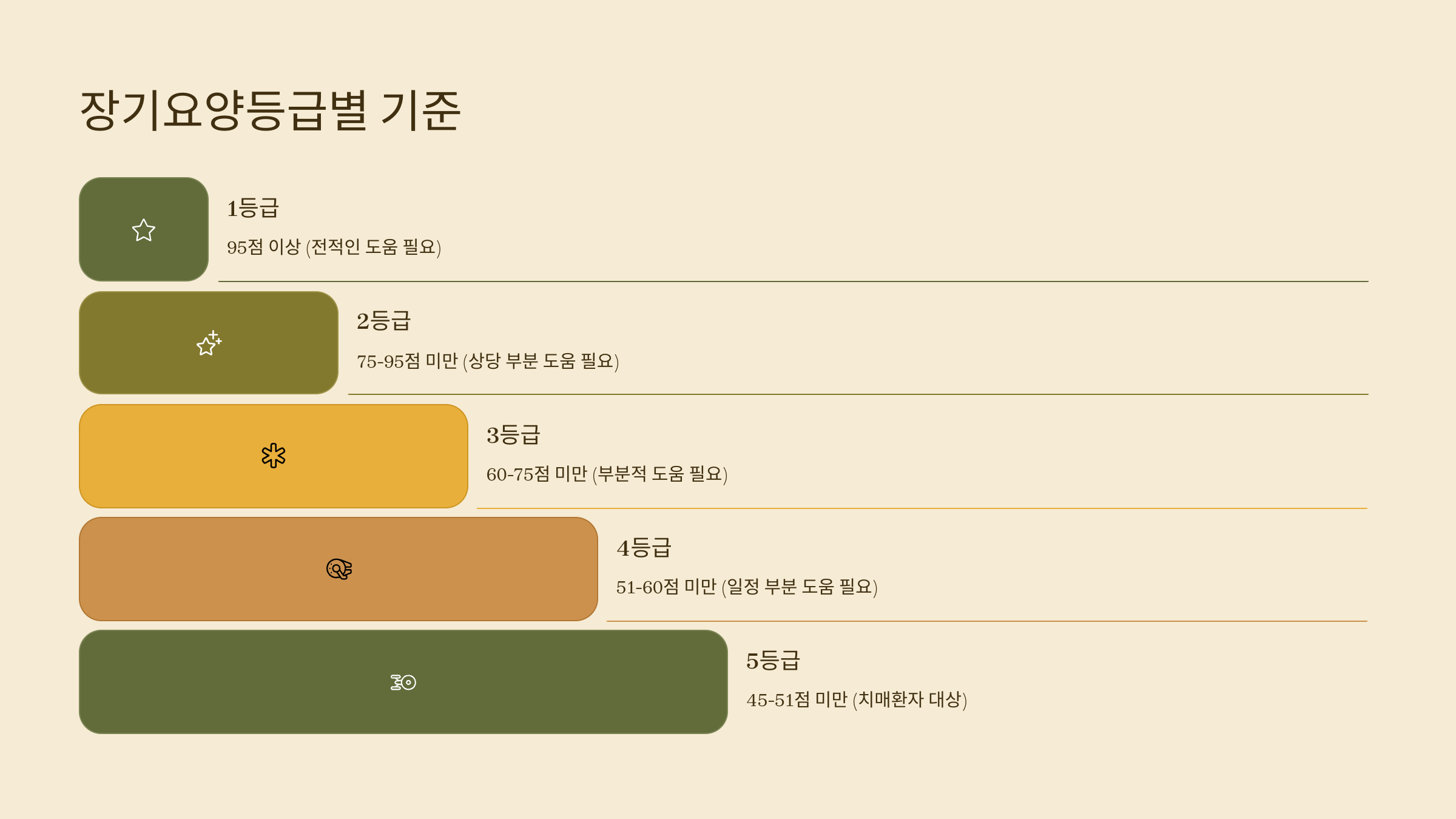 이렇게 정해진 등급에 따라 돌봄서비스나 시설을 선택할 수 있어요. 등급이 높을수록 더 많은 지원을 받을 수 있으니, 부모님의 상태를 정확히 전달하는 게 중요해요.